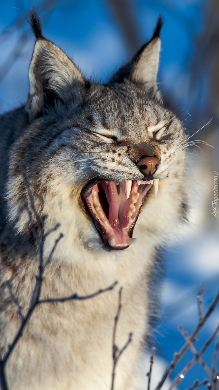 Edytor tapety: Ryś z zamkniętymi oczami szczerzący kły