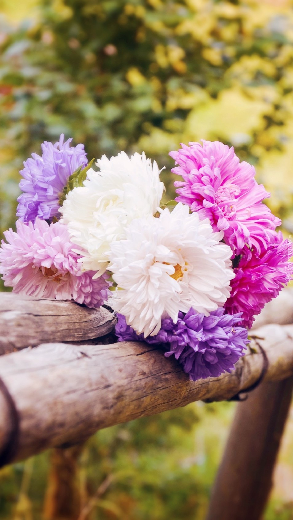 Edytor tapety: Bukiet kolorowych astrów ułożony na belce