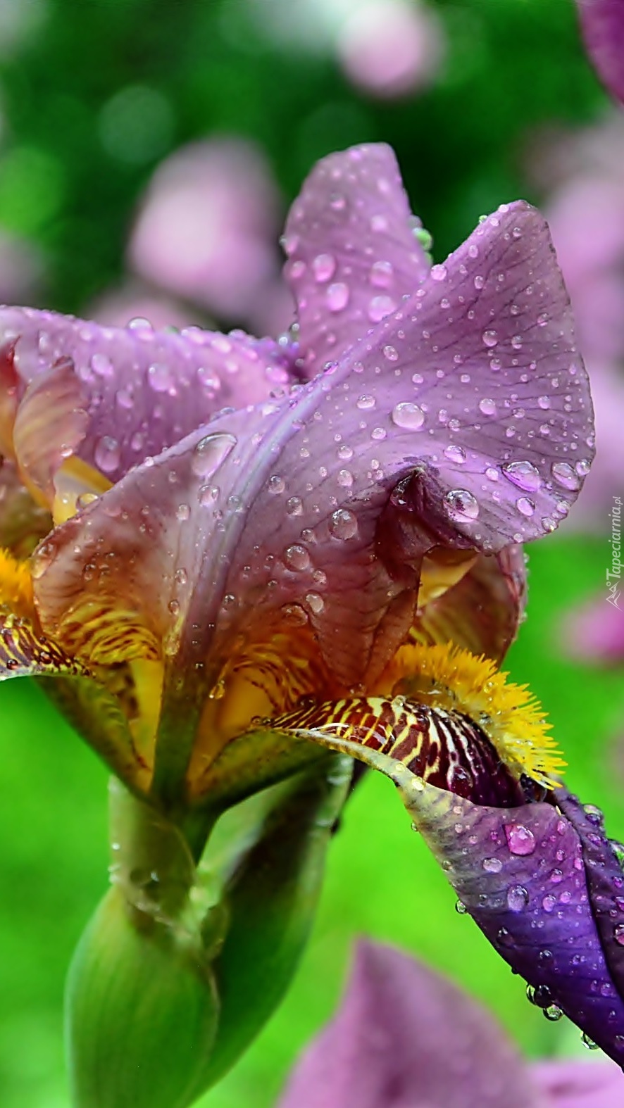 Edytor tapety: Krople deszczu na kolorowym kwiecie irysa