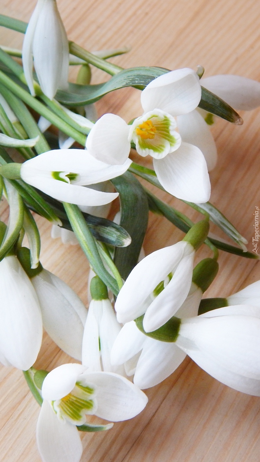 Edytor tapety: Bukiet białych przebiśniegów na deskach