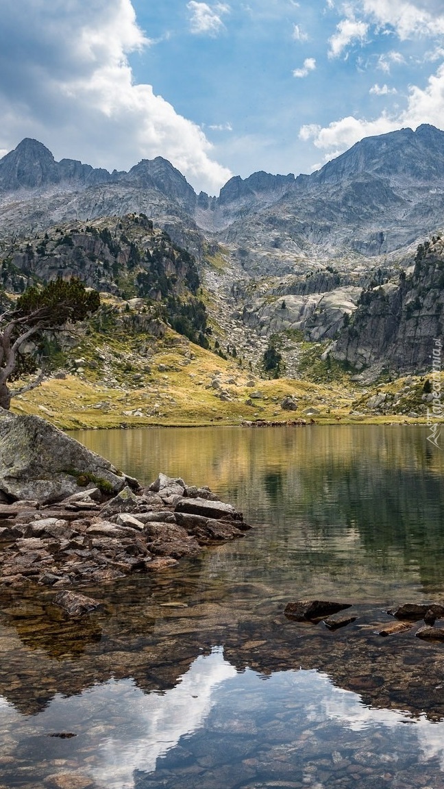 Edytor tapety: Odbicie gór i kamienie w jeziorze