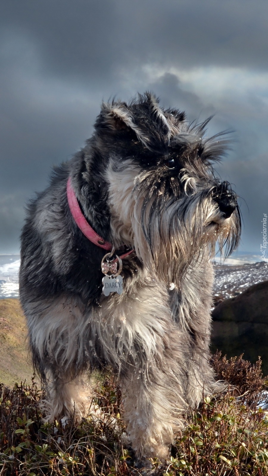 Edytor tapety: Sznaucer miniaturka na skałach w zimie