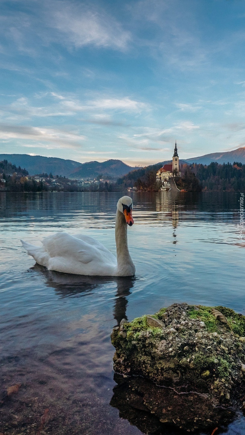 Edytor tapety: Łabędź podpłynął do brzegu jeziora