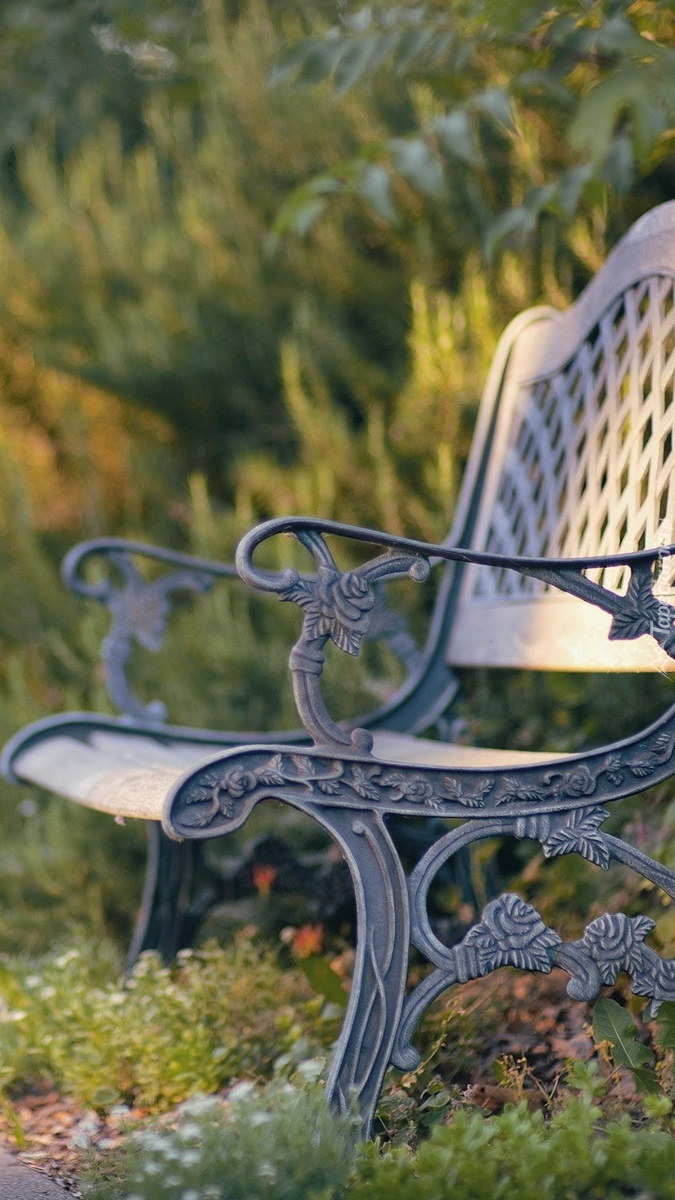 Edytor tapety: Metalowa ławeczka w parku między krzewami