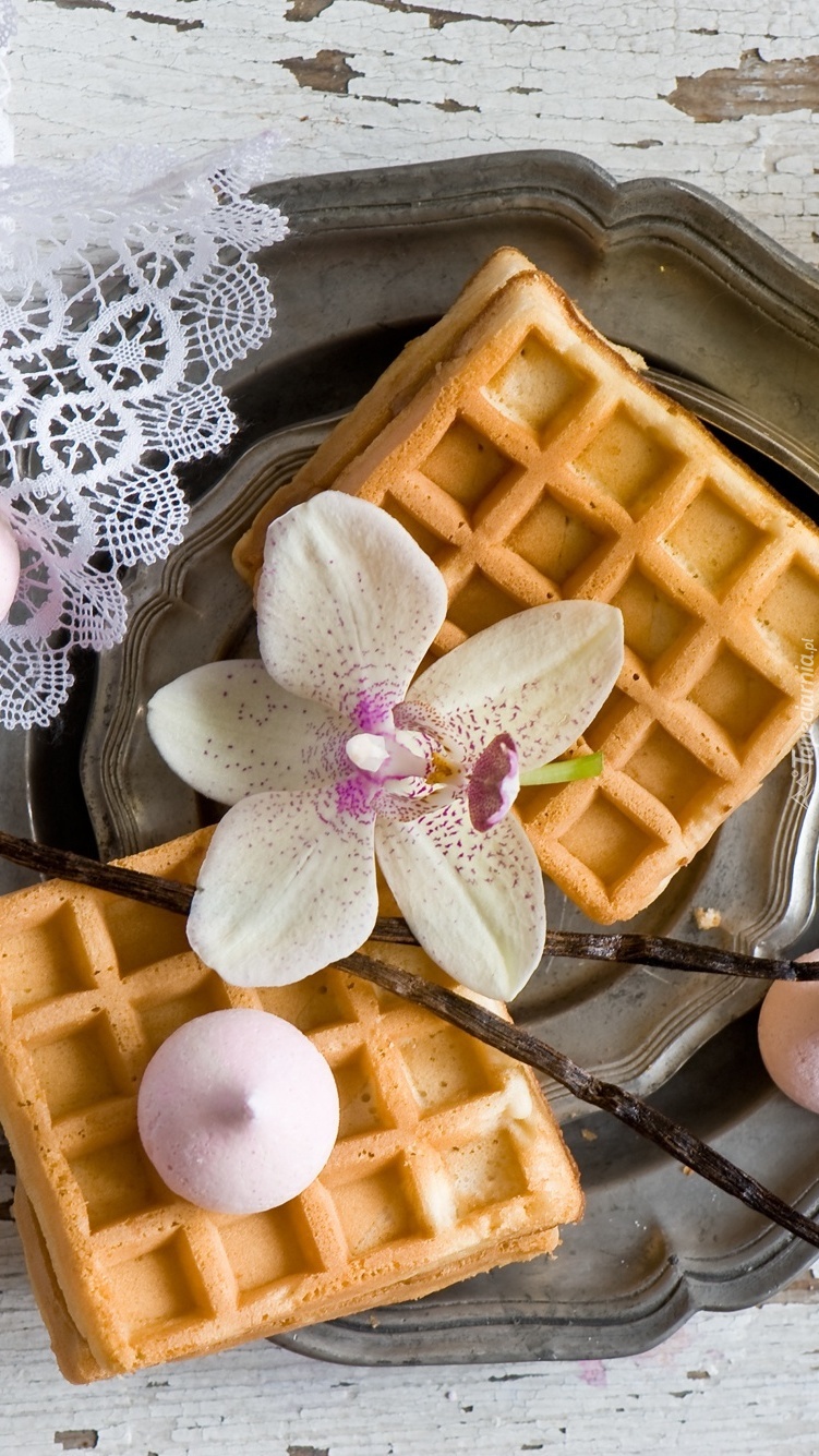 Edytor tapety: Gofry na talerzyku z kwiatkiem storczyka