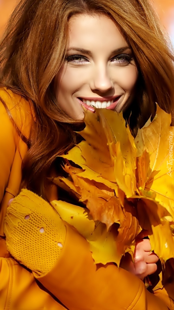 Edytor tapety: Kobieta z jesiennymi liśćmi klonu
