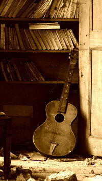 Edytor tapety: Gitara oparta o półkę z książkami