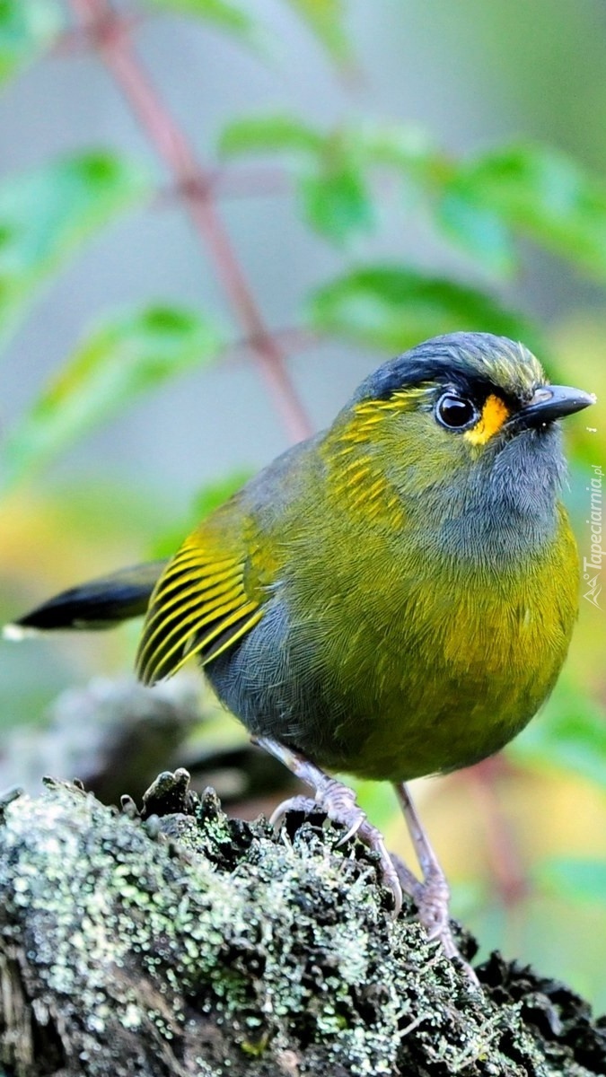 Edytor tapety: Zielonkawy ptaszek rozgląda się wokoło