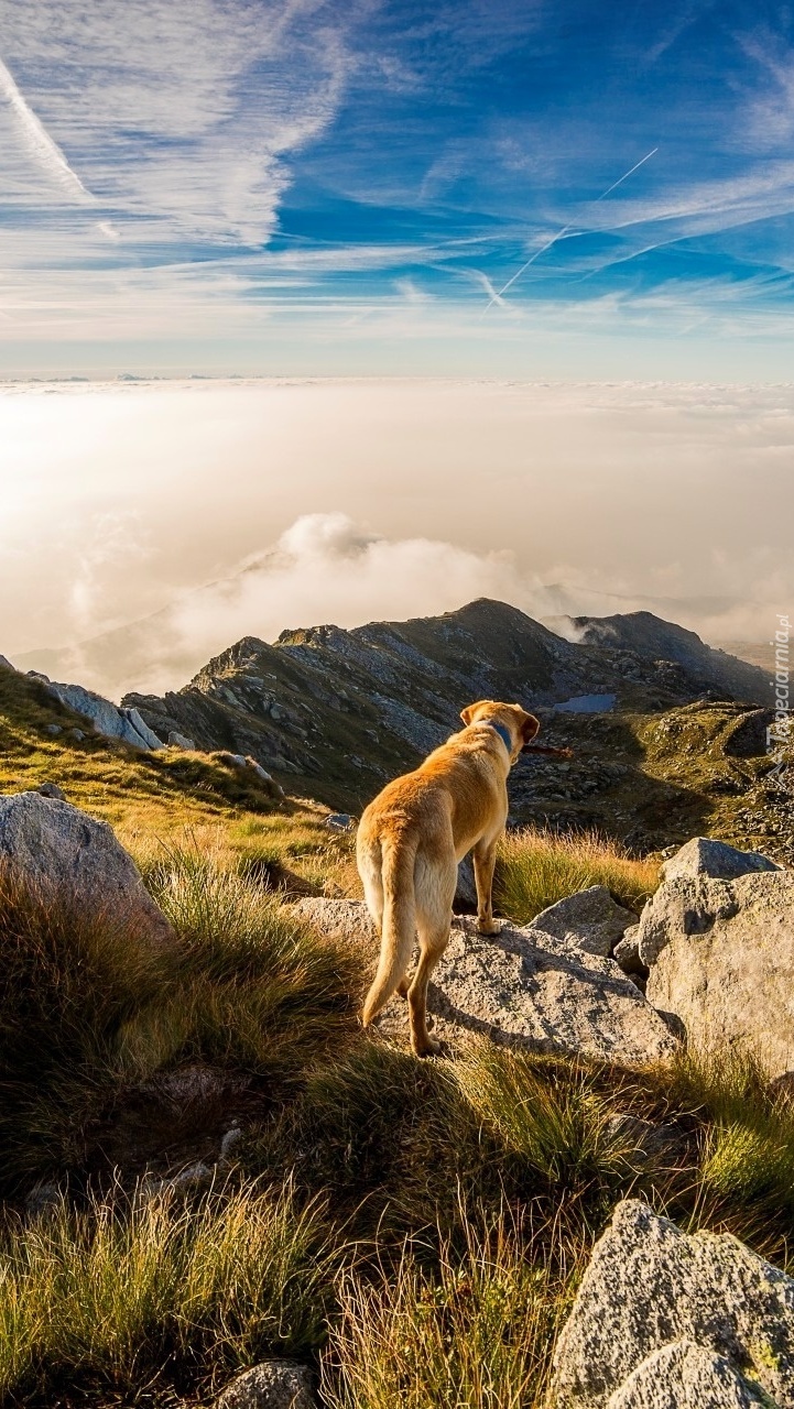 Edytor tapety: Pies w górach na skale