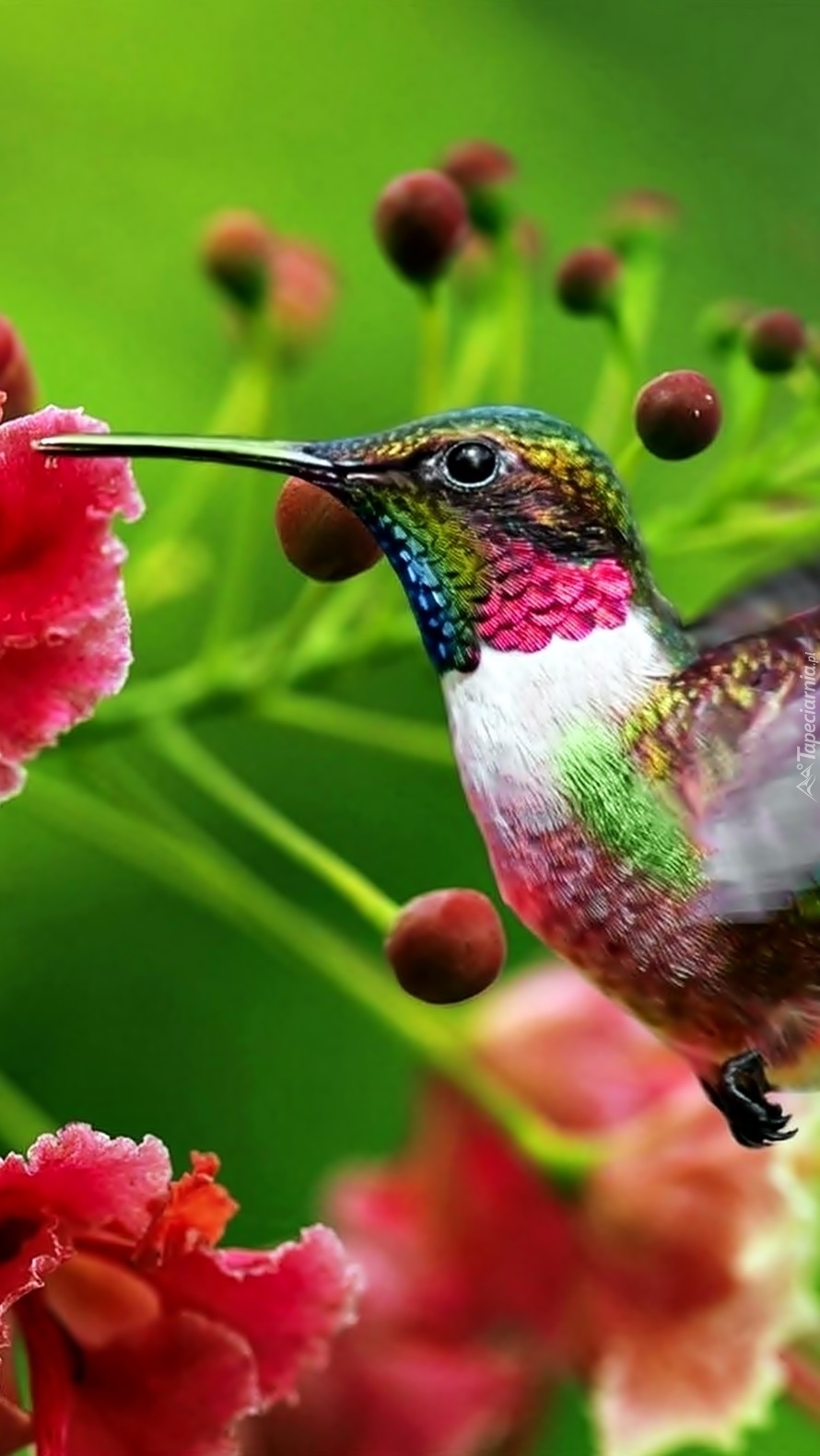 Edytor tapety: Kolorowy koliber przy czerwonym kwiatku