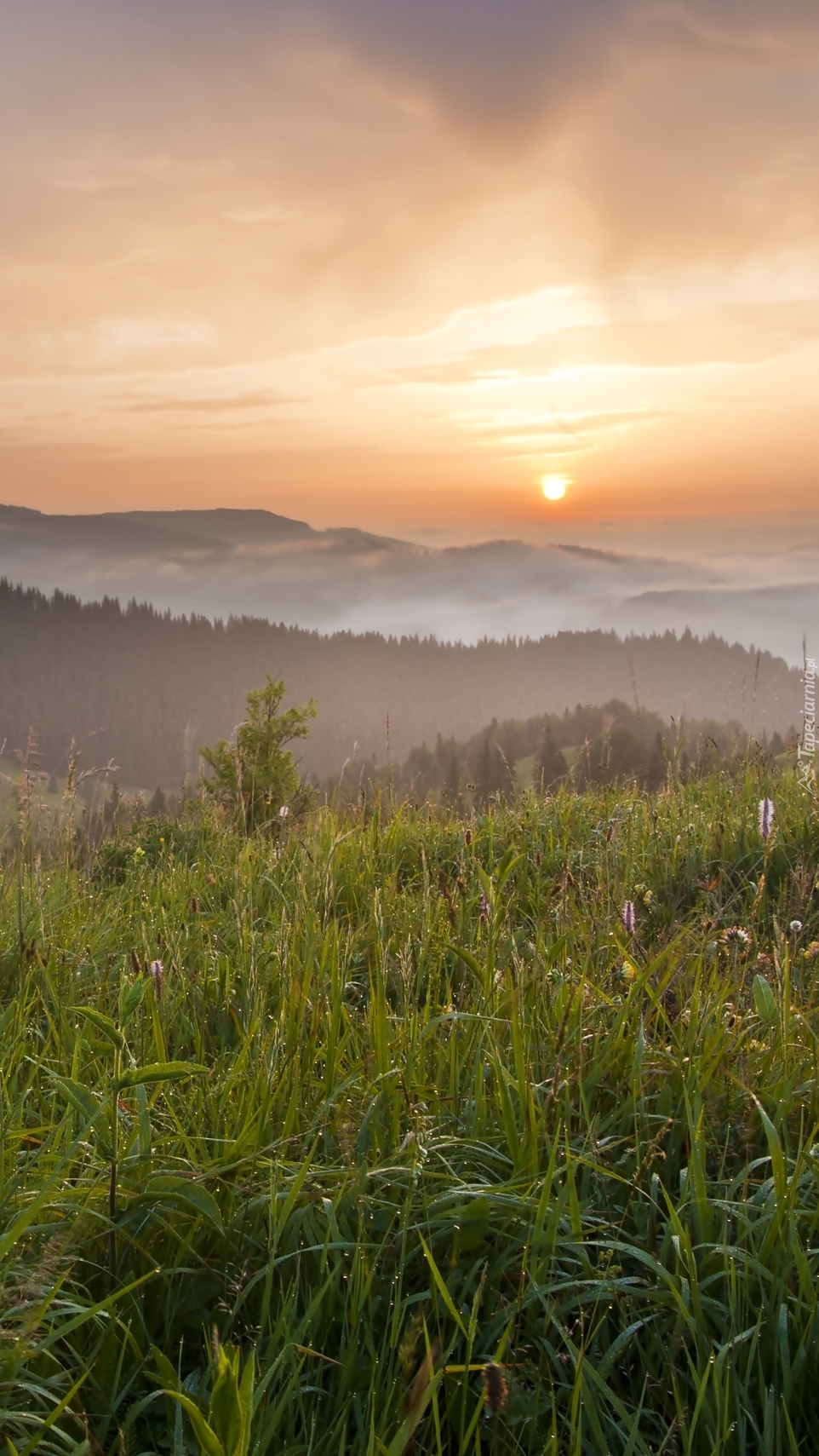 Edytor tapety: Zachód słońca nad górami i łąką