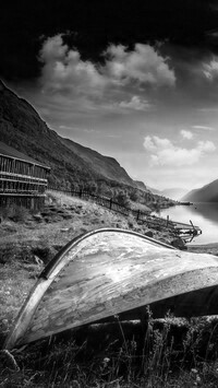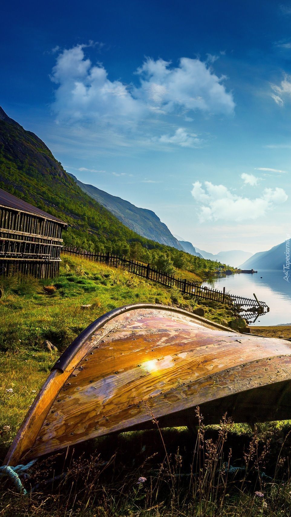 Edytor tapety: Łódka na brzegu norweskiego jeziora