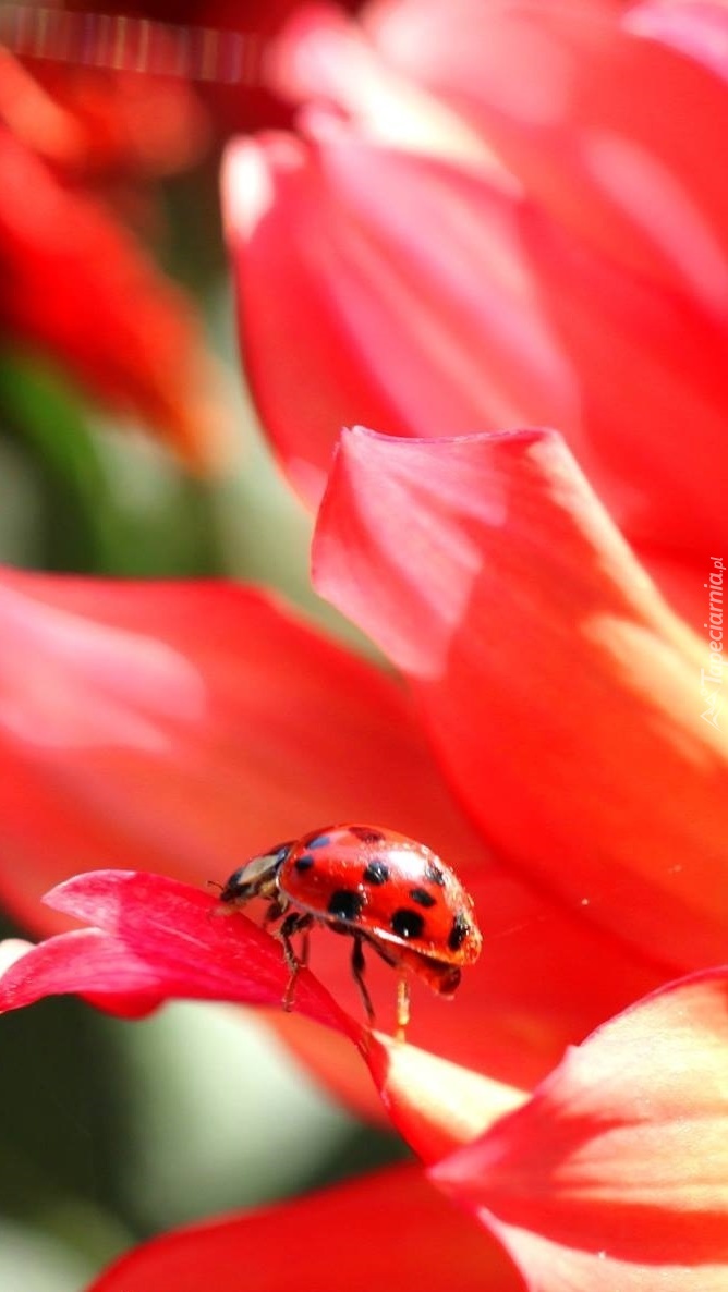 Edytor tapety: Biedronka na czerwonym kwiatku