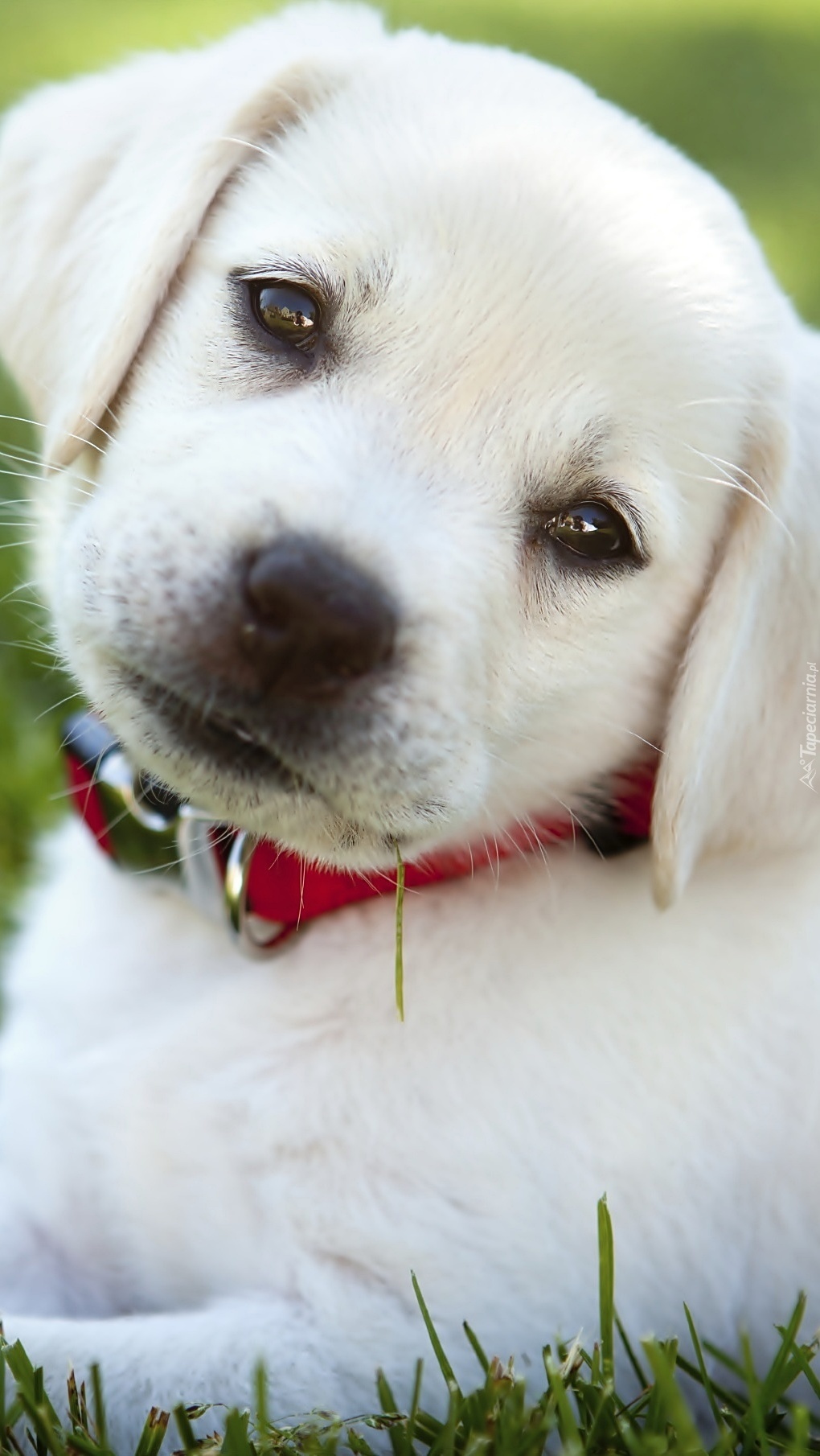Edytor tapety: Biały szczeniak w obroży na trawie