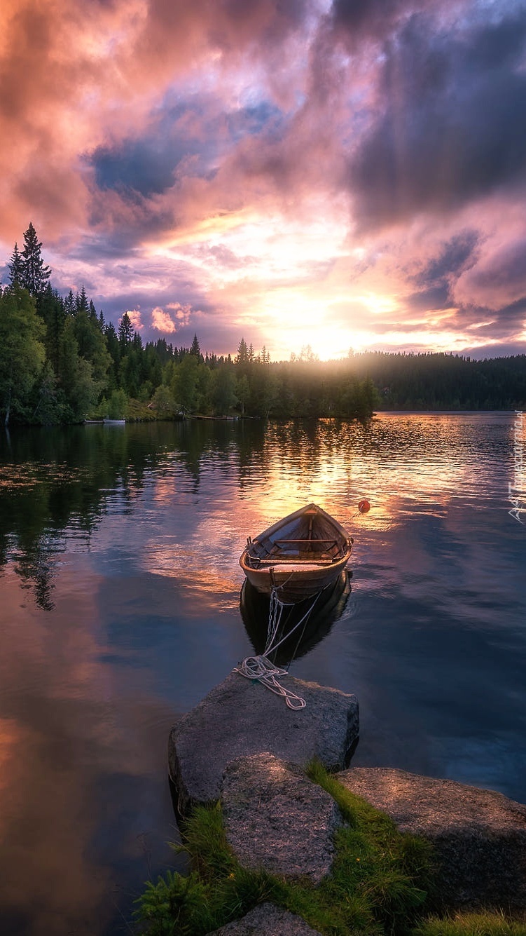Edytor tapety: Łódź na jeziorze przycumowana do kamienia