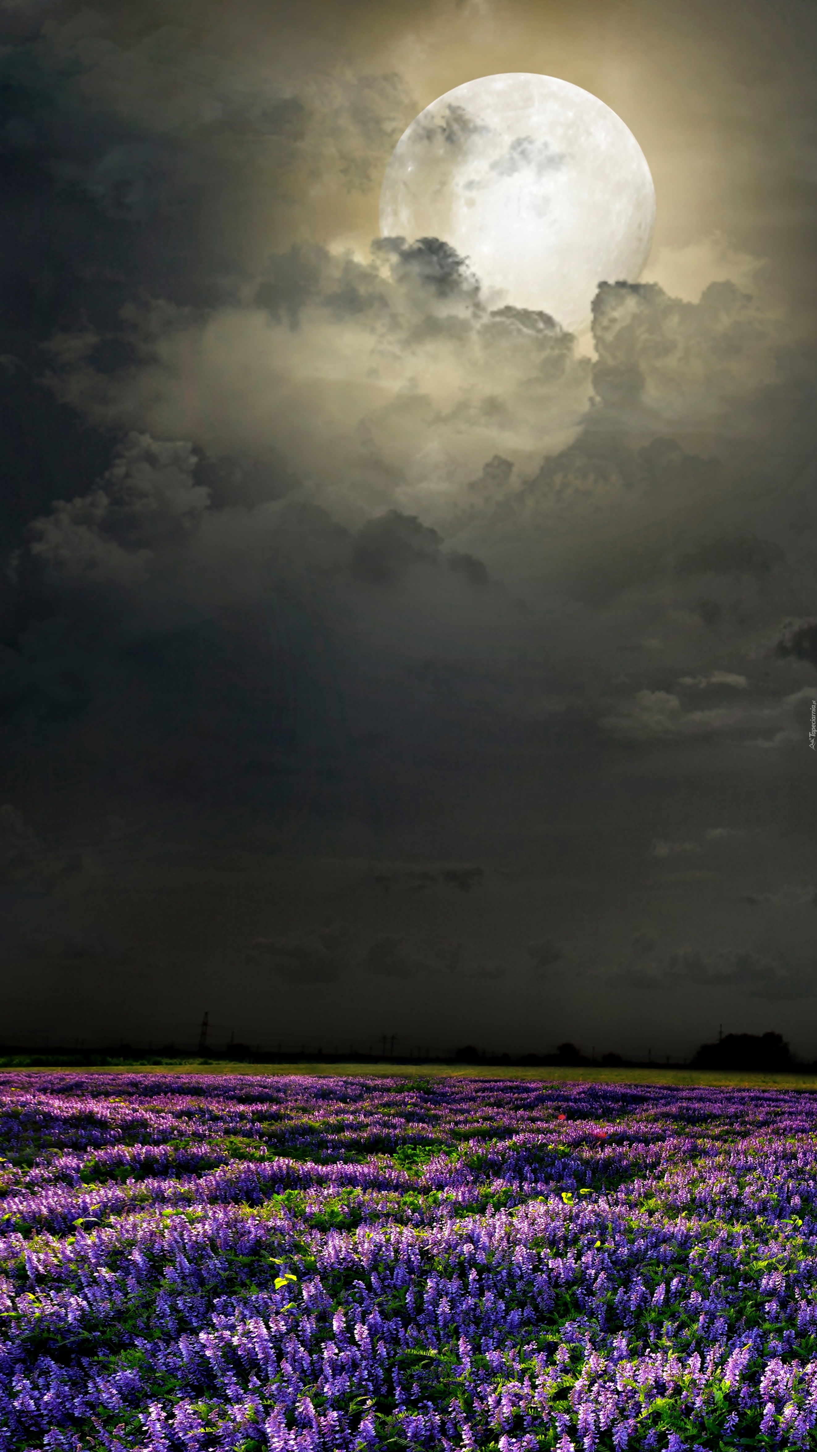 Edytor tapety: Nocny księżyc nad polami łubinu