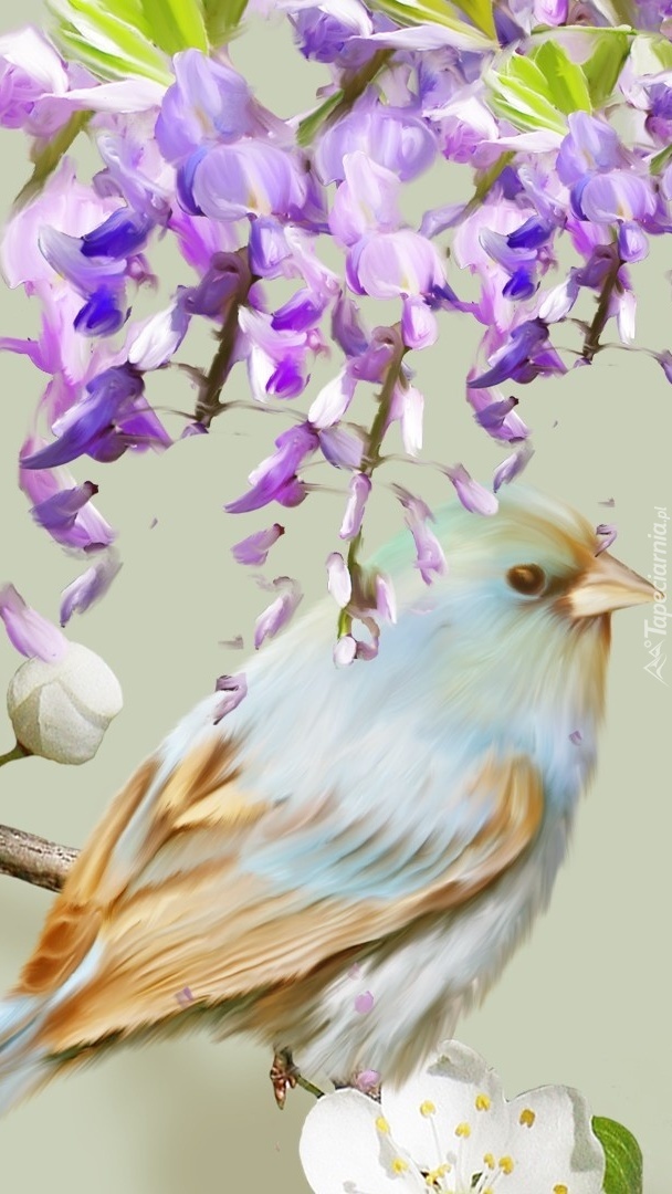 Edytor tapety: Ptaszek na gałązce pod kwiatkami