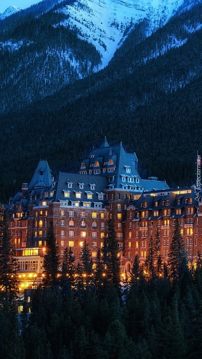 Edytor tapety: Górski hotel wśród lasów o zmierzchu