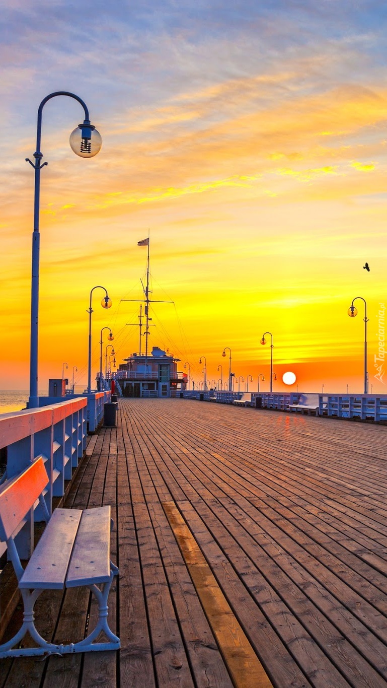 Edytor tapety: Molo z ławkami w zachodzącym słońcu