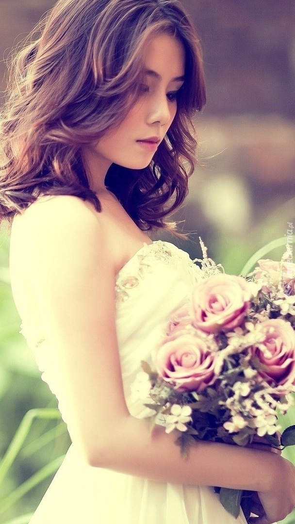 Edytor tapety: Dziewczyna w białej sukni z bukietem