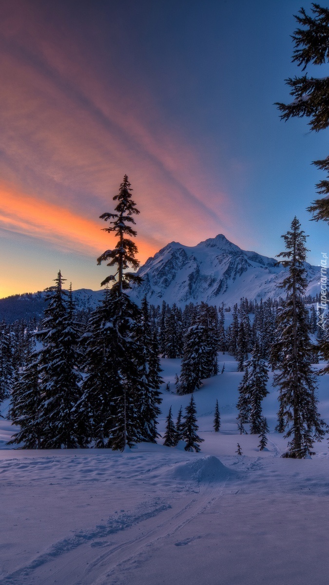 Edytor tapety: Ścieżka w śniegu o zmierzchu