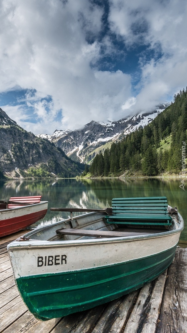 Edytor tapety: Łodzie na pomoście przy brzegu jeziora
