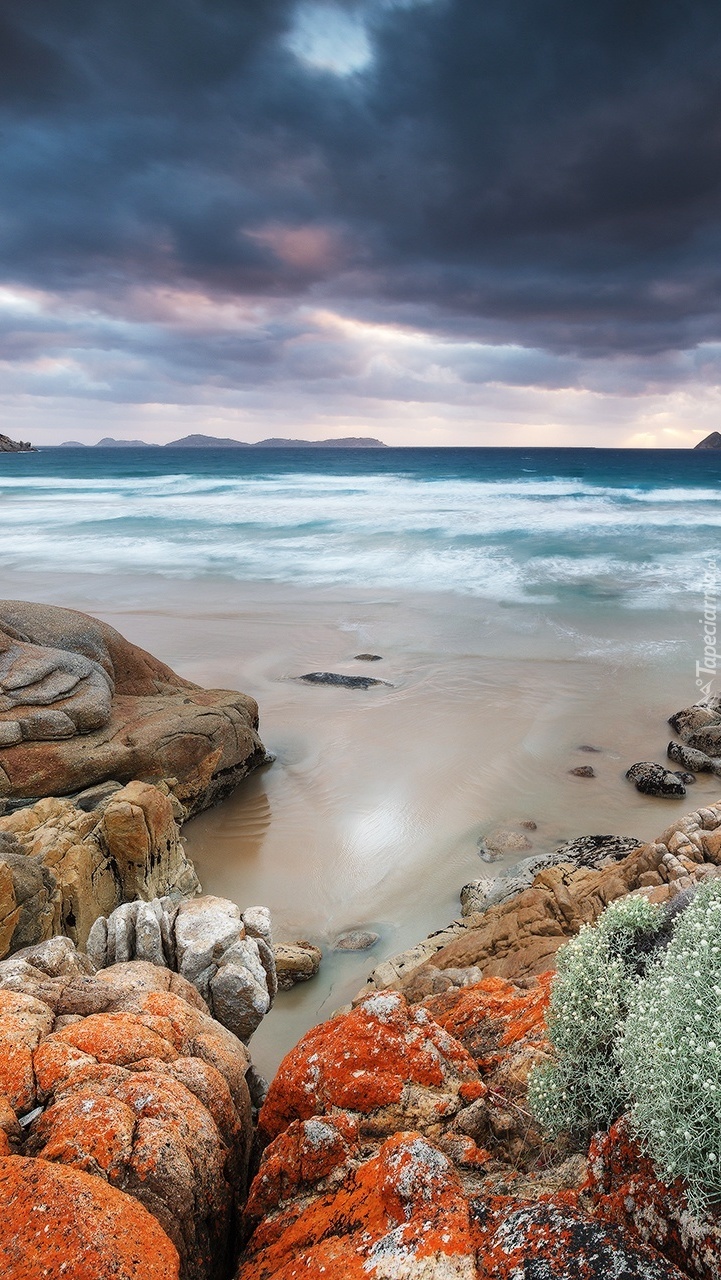 Edytor tapety: Ciemne niebo nad skałami i morzem