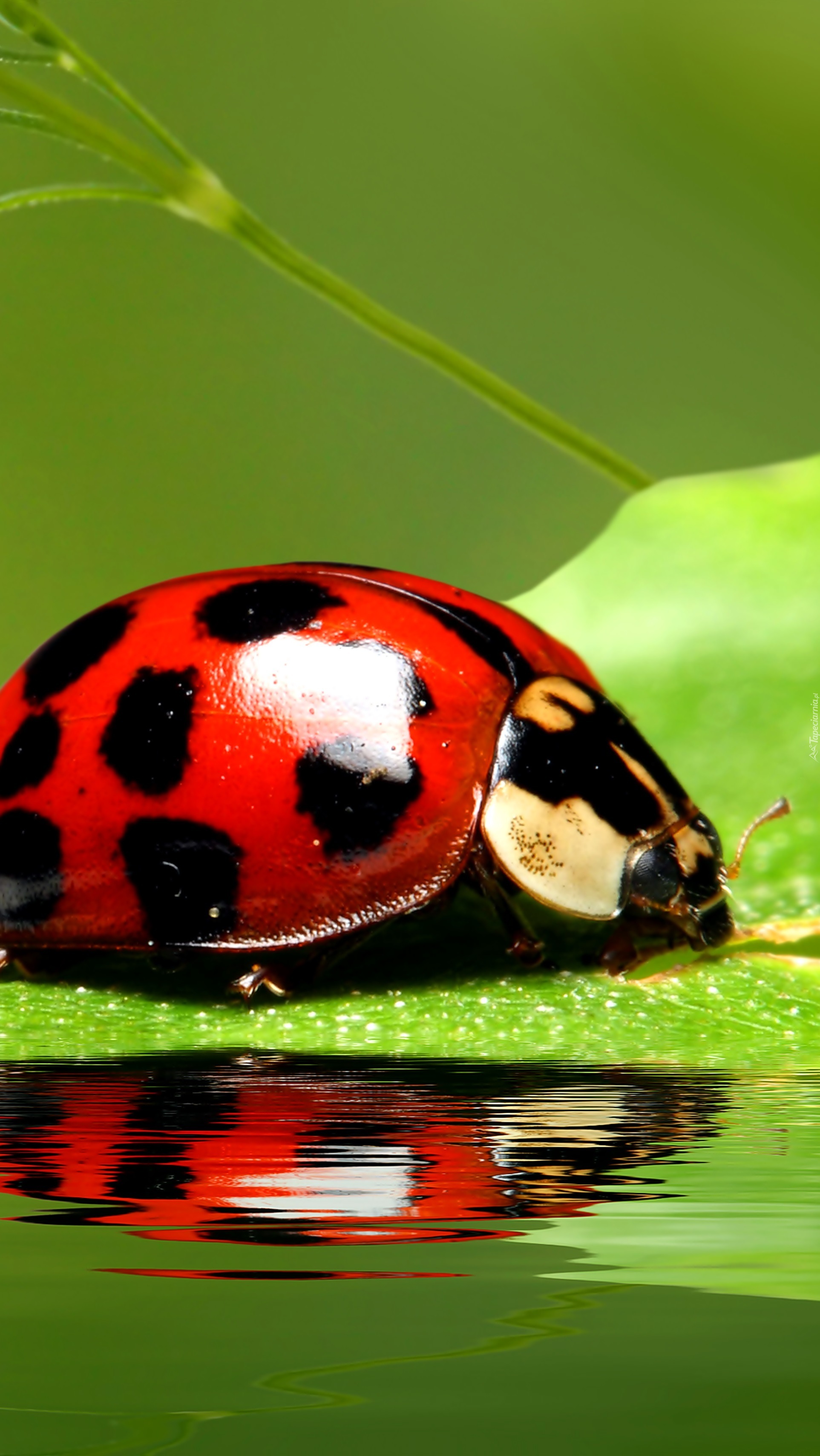 Edytor tapety: Biedronka na liściu odbita w wodzie