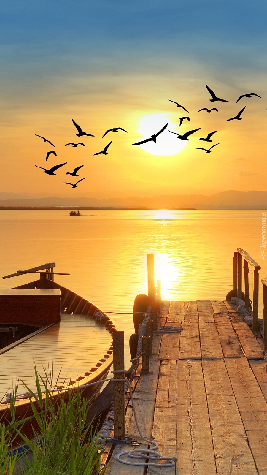 Edytor tapety: Przelot ptaków nad jeziorem wczesnym rankiem