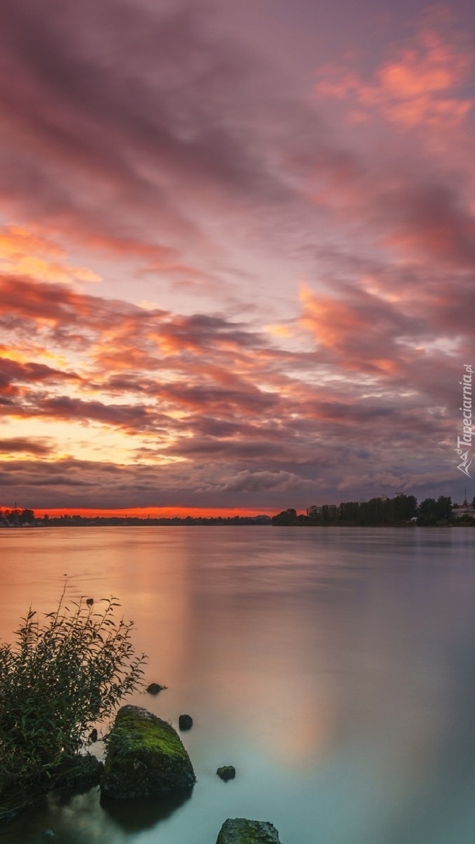 Edytor tapety: Zachód słońca za chmurami nad jeziorem