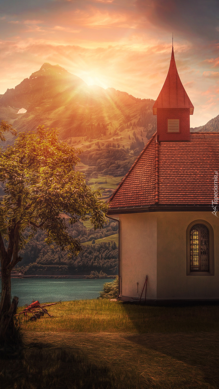 Edytor tapety: Kościółek nad jeziorem w Szwajcarii