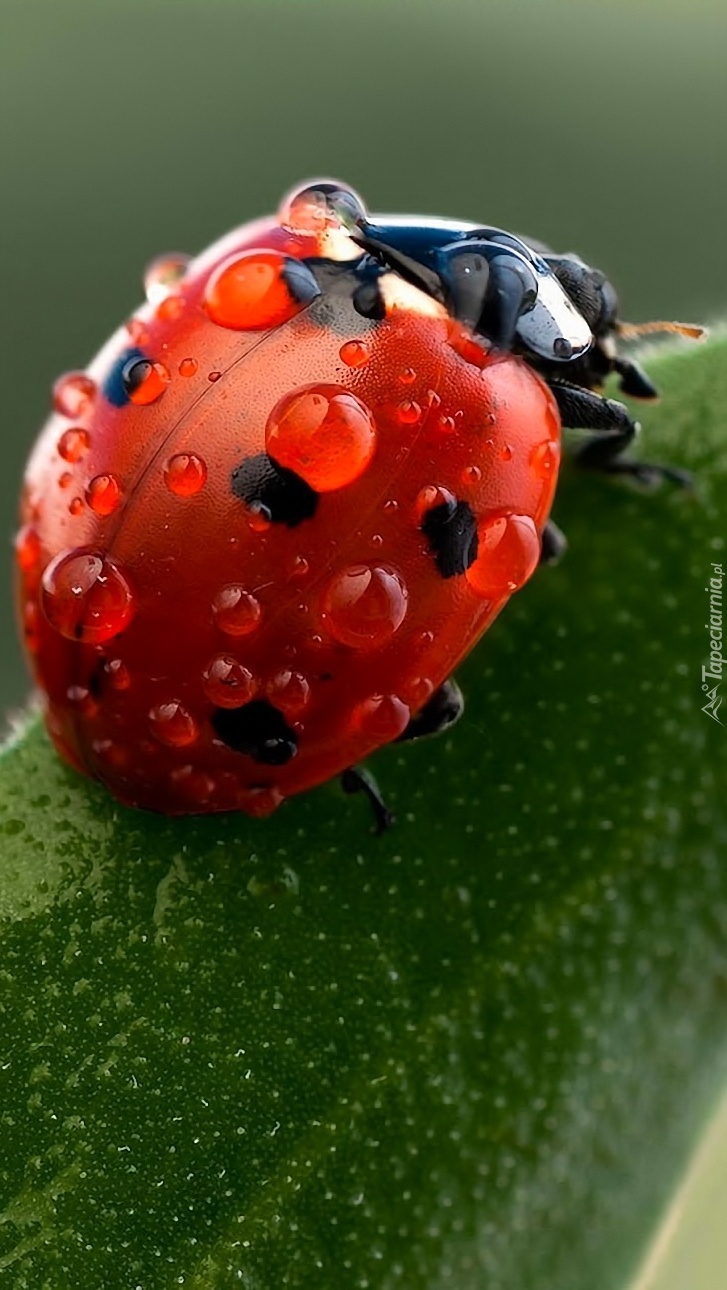 Edytor tapety: Biedronka na liściu w kroplach wody