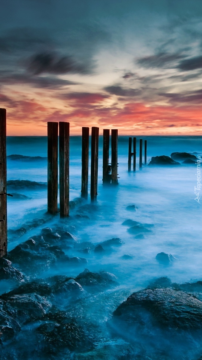 Edytor tapety: Morze z palami o zachodzie słońca