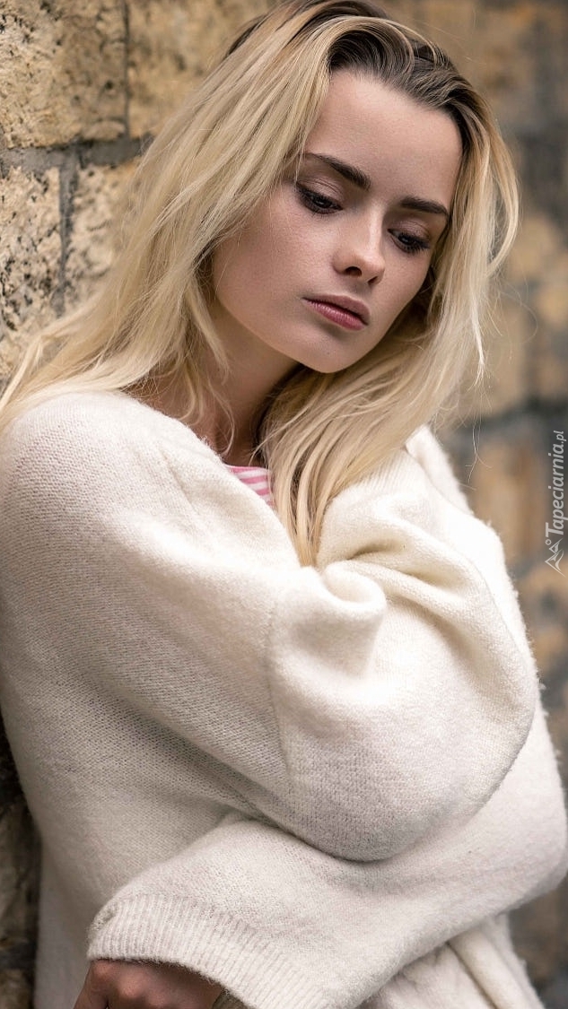 Edytor tapety: Zasmucona kobieta przy ceglanym murze