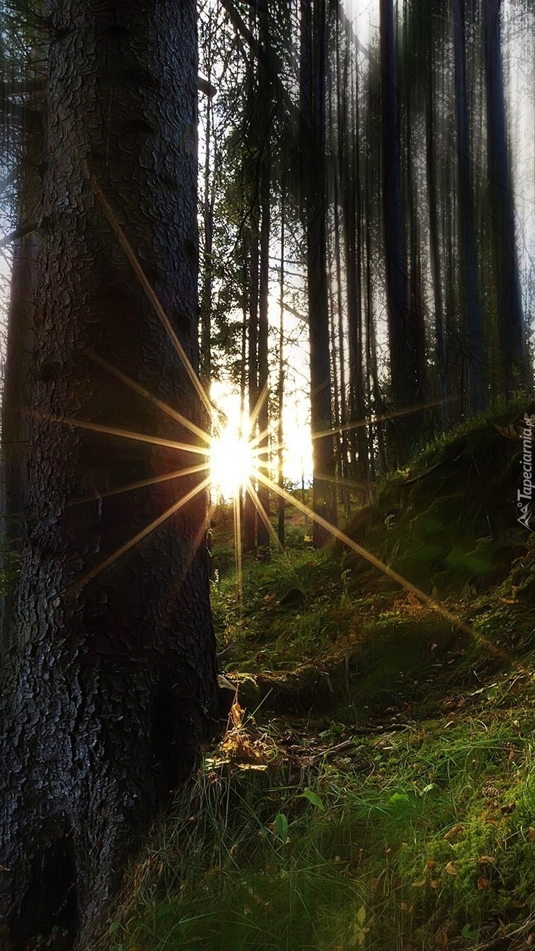 Edytor tapety: Promienie słońca między drzewami