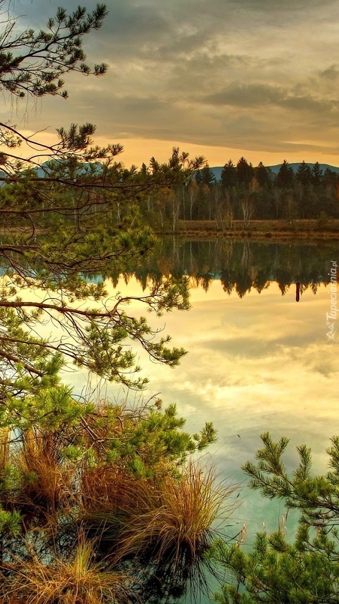 Edytor tapety: Las z jeziorem o zachodzie słońca