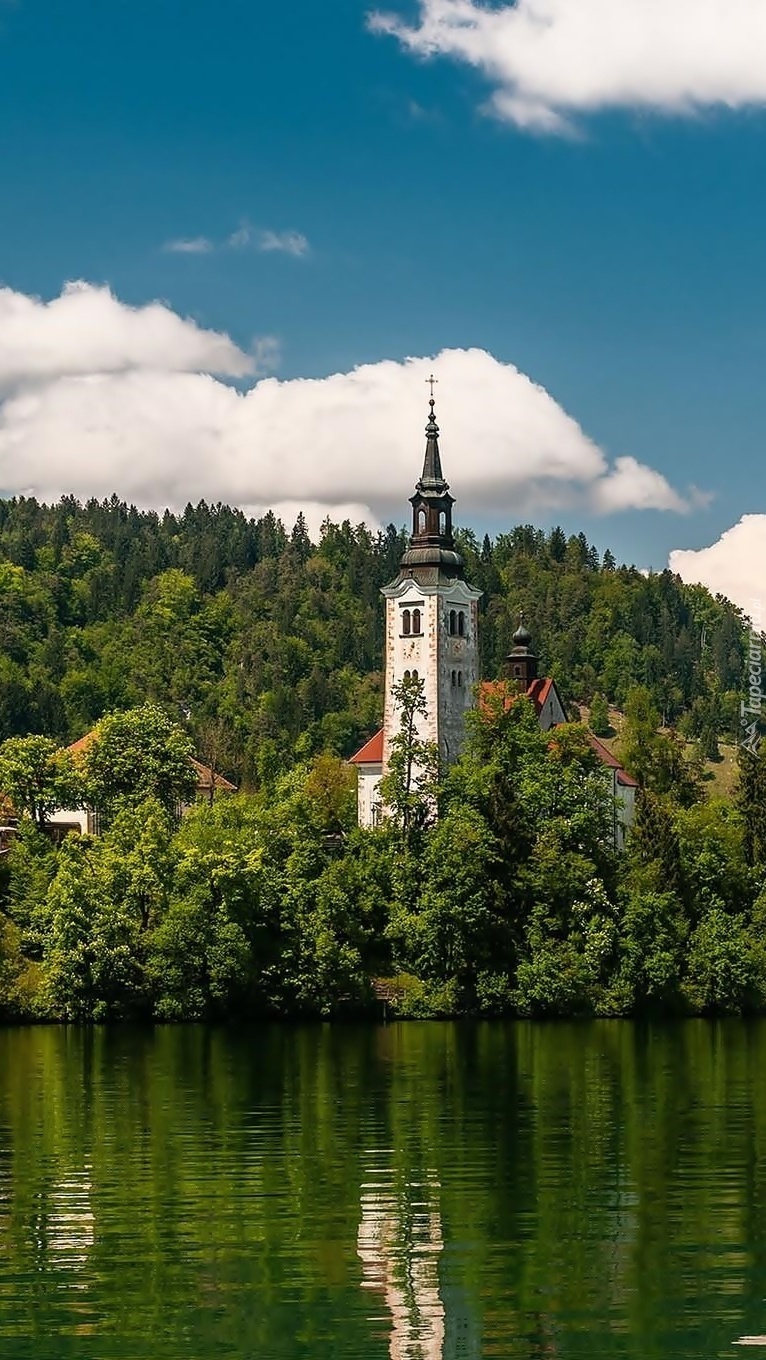 Edytor tapety: Kościół nad jeziorem w Słowenii