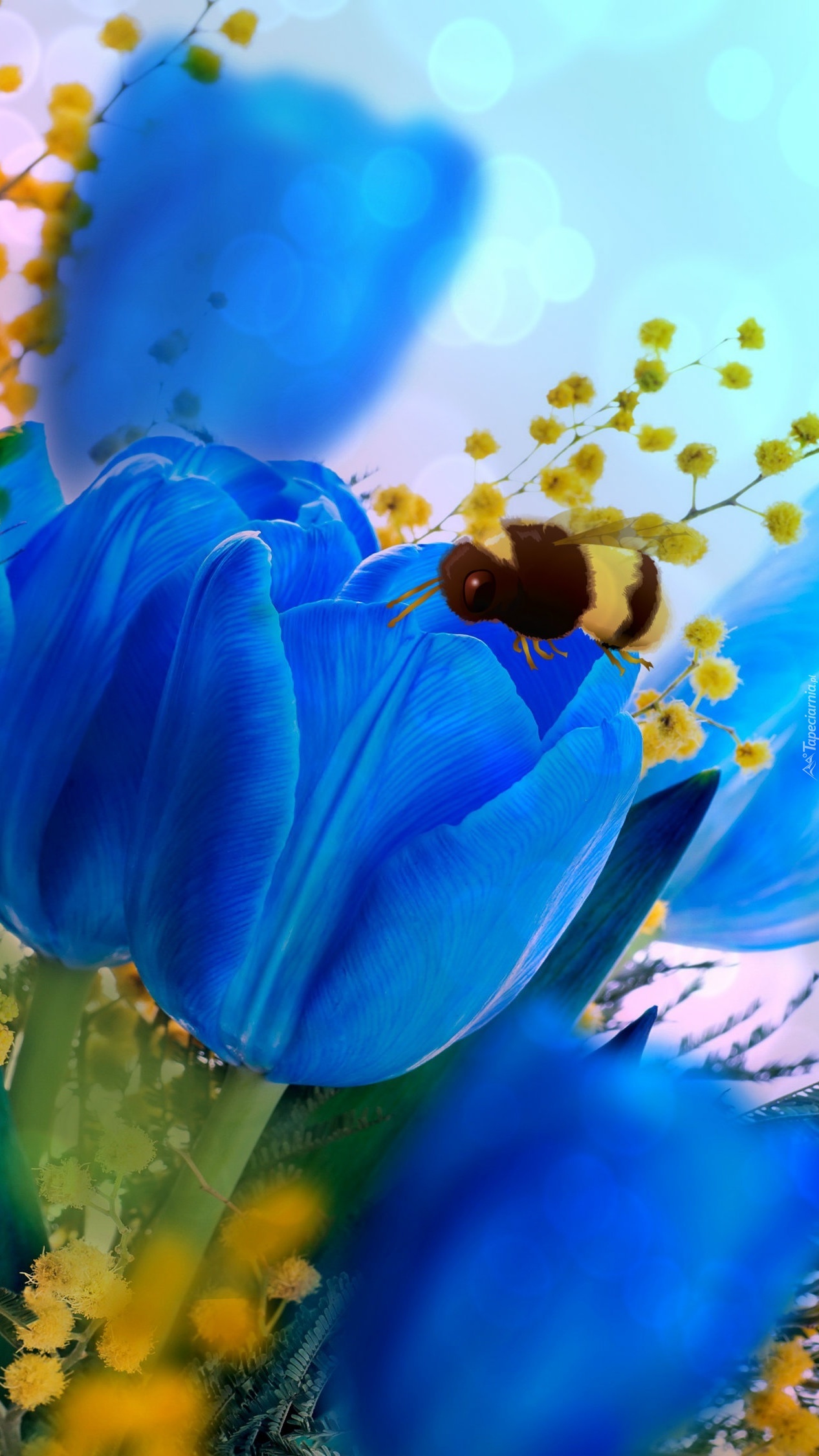 Edytor tapety: Niebieskie tulipany i pszczoła