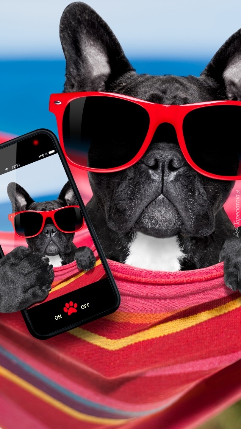 Edytor tapety: Buldog francuski w okularach z telefonem