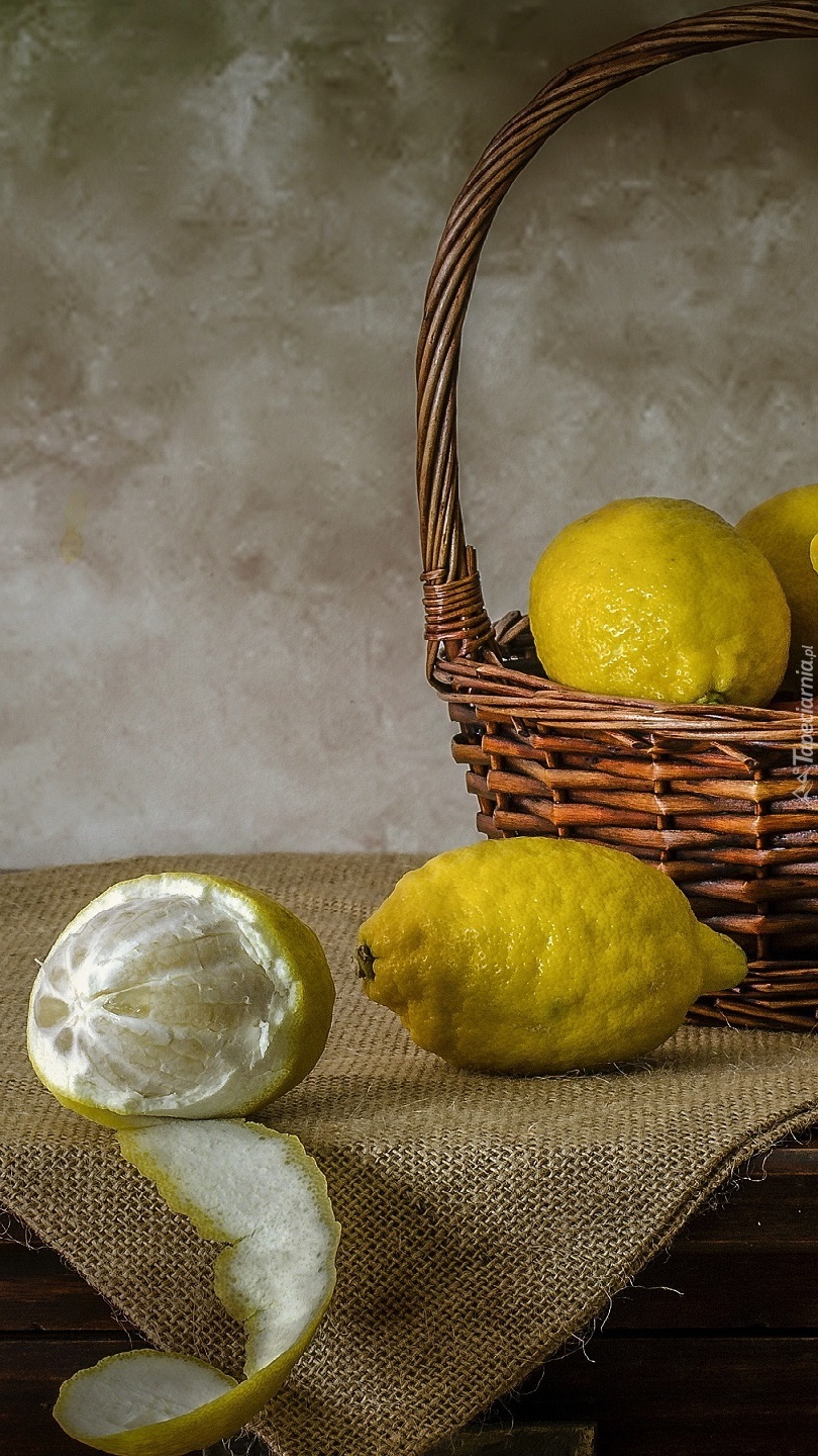 Edytor tapety: Obrana cytryna obok koszyka cytryn