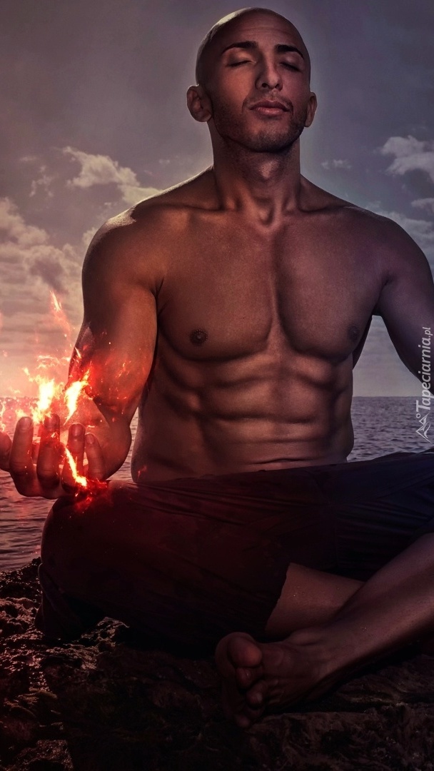 Edytor tapety: Medytujący mężczyzna z ogniem w dłoni