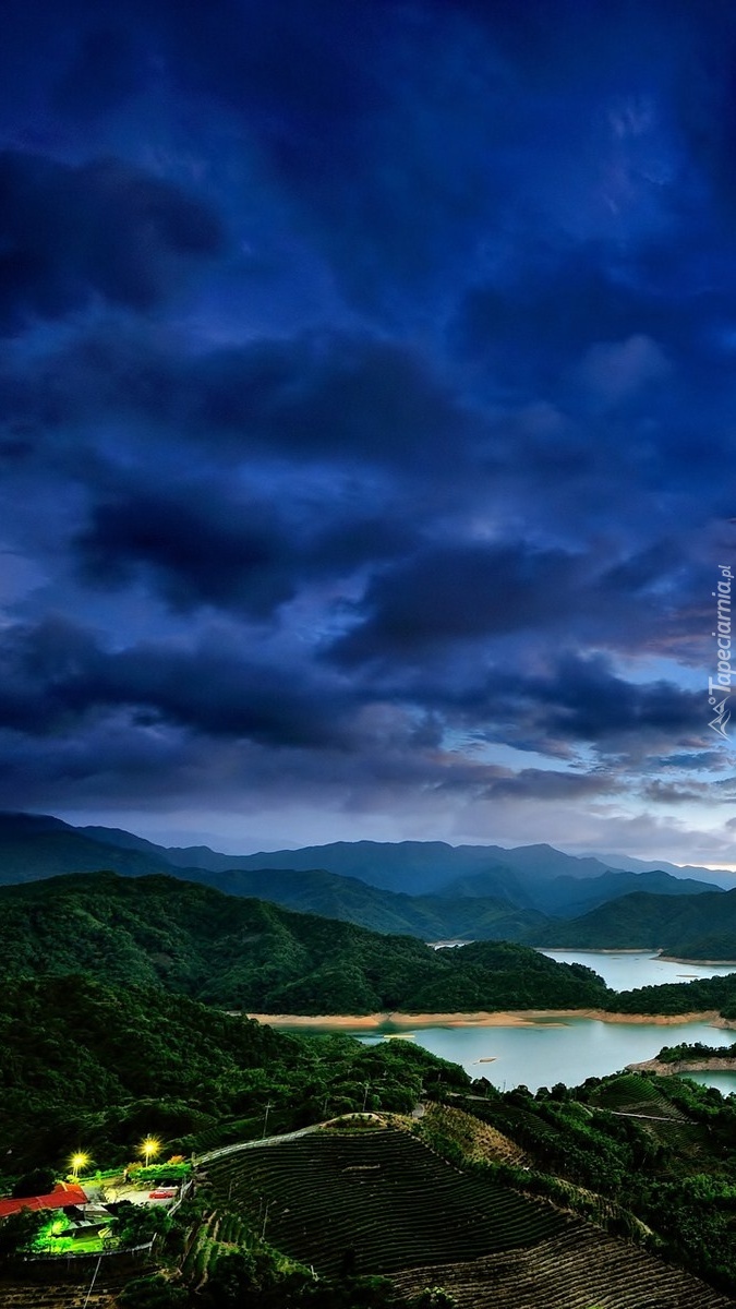 Edytor tapety: Ciemne chmury nad rzeką i lasem