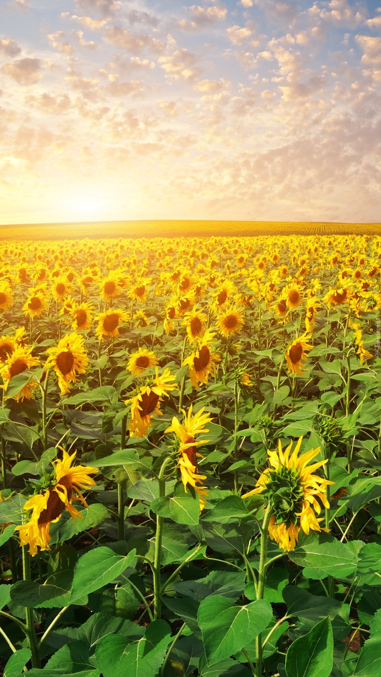 Edytor tapety: Zachód słońca nad słonecznikowym polem