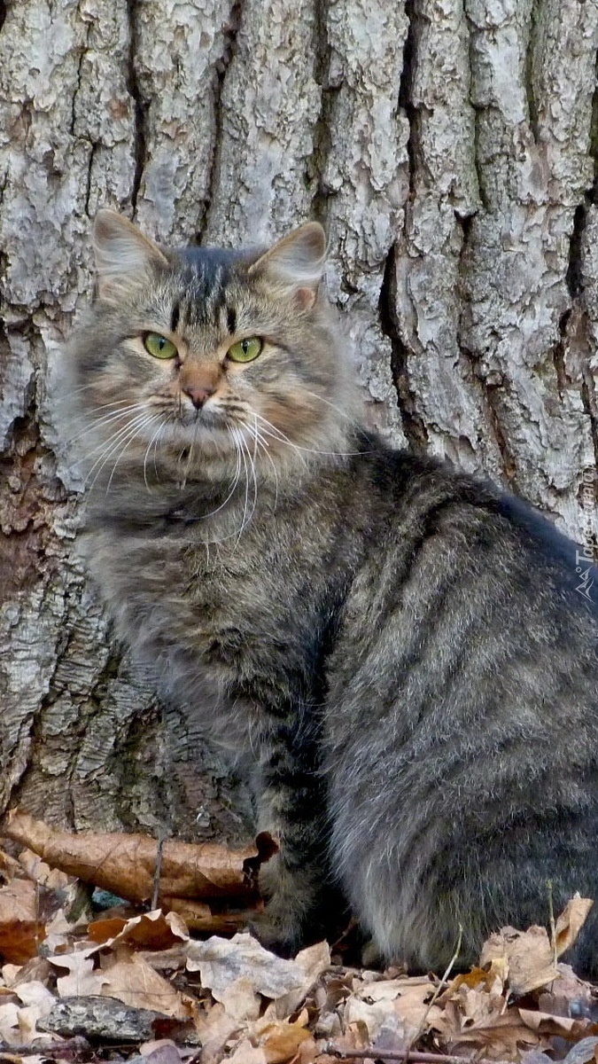 Edytor tapety: Szaro-bury kociak przy drzewie