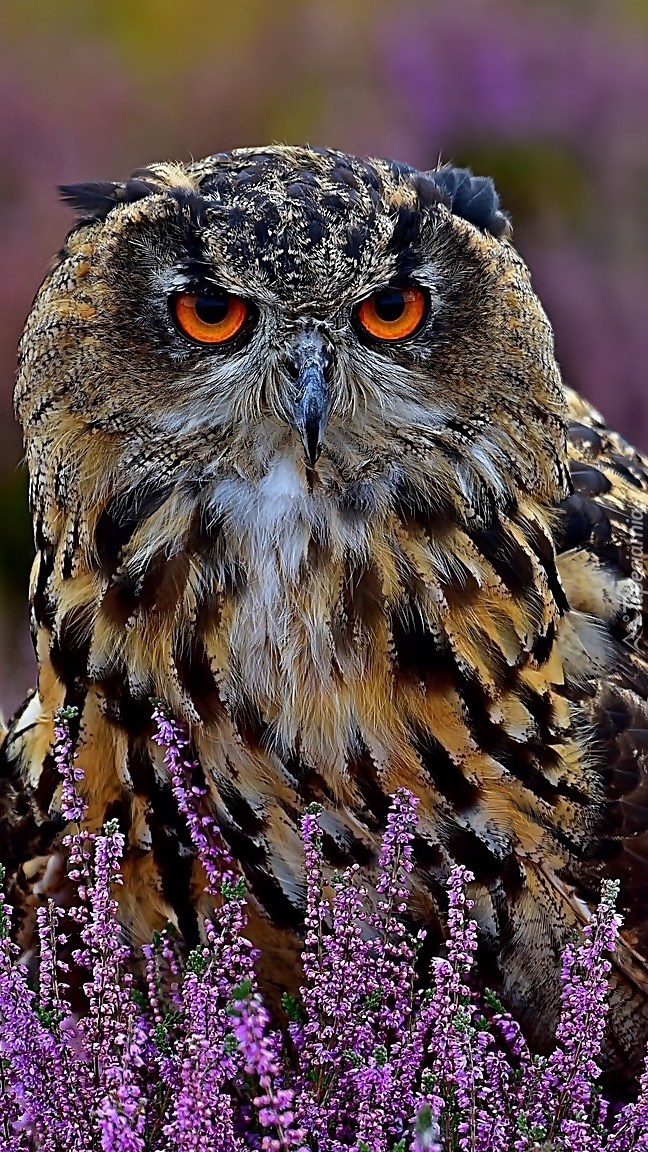 Edytor tapety: Nastroszona sowa we wrzosach