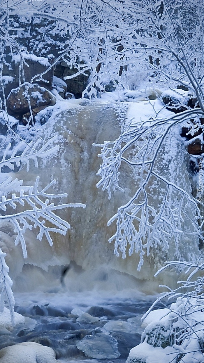 Edytor tapety: Ośnieżone drzewa nad wodospadem