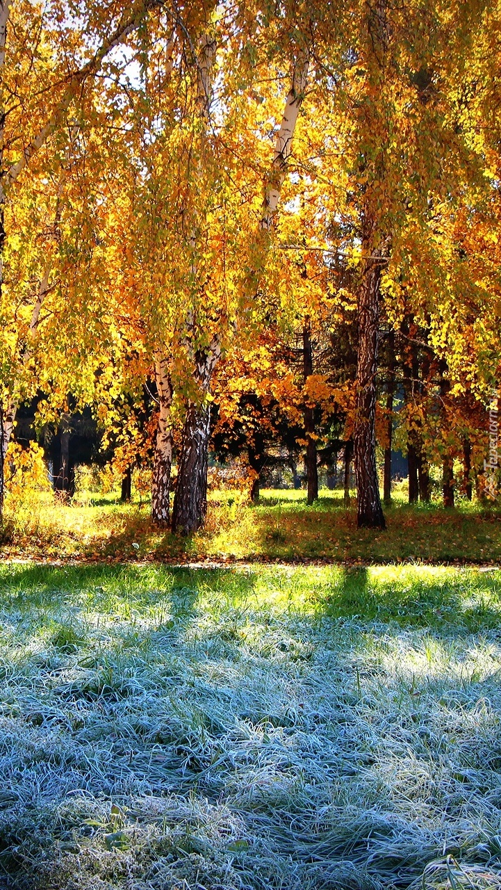 Edytor tapety: Brzozowy las i szron na trawie