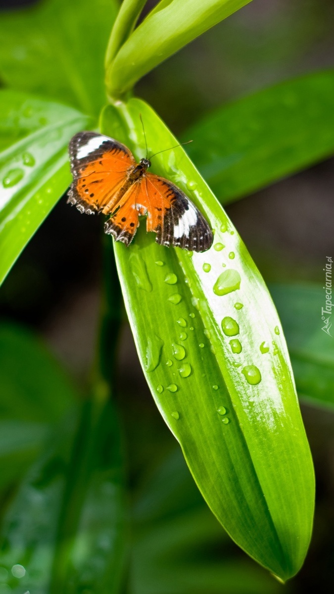 Edytor tapety: Motylek na liściu w kroplach