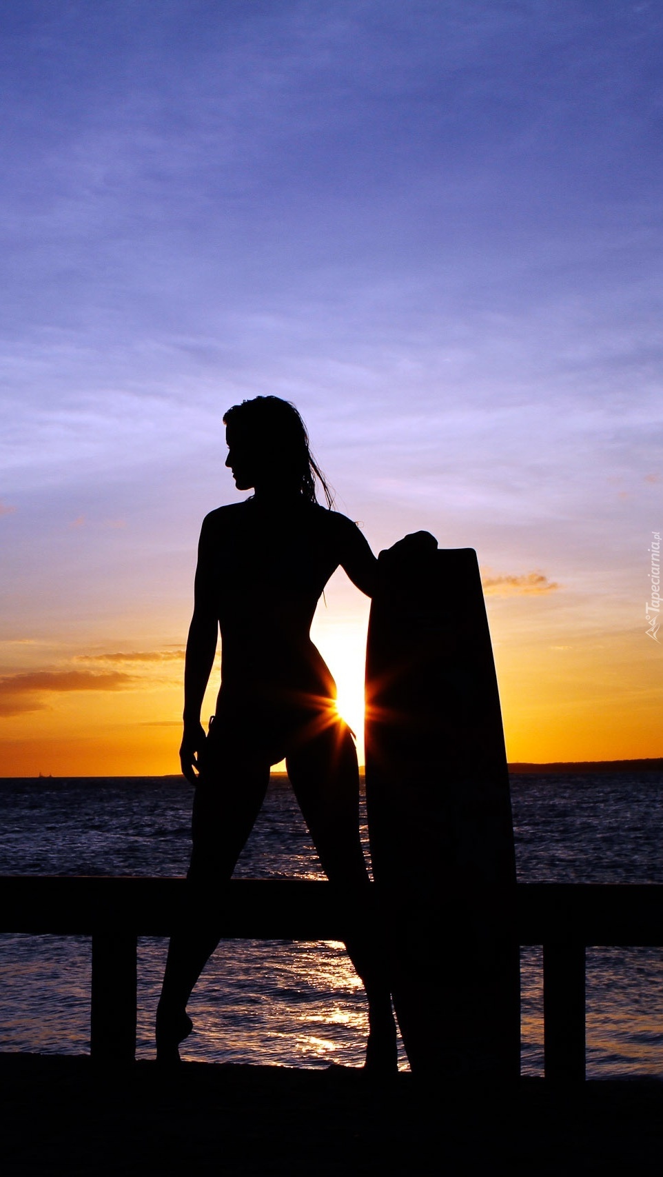 Edytor tapety: Kobieta nad morzem o zachodzie słońca