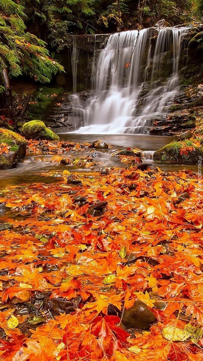 Edytor tapety: Leśny wodospad z jesiennymi liśćmi